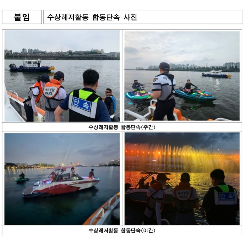해양경찰·서울경찰청 한강경찰대와 합동으로 주야간 불시 특별 단속기간을 확대할 예정이다. 야간 수상레저활동 시 야간 안전 운항 장비 완비 여부, 위협 운항, 수상레저기구 이용 시간대 위반 등 불법행위 적발 및 행정조치도 병행한다.