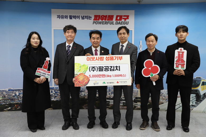 이재홍 대구광역시 보건복지국장은 “어려운 이웃들을 위해 꾸준히 기부 활동을 펼쳐온 영농조합법인 팔공김치에 깊은 감사를 표한다”며 “이번에 기탁된 배추김치는 어려운 이웃들에게 따뜻한 위로가 될 수 있도록 소중히 전달하겠다”고 말했다.