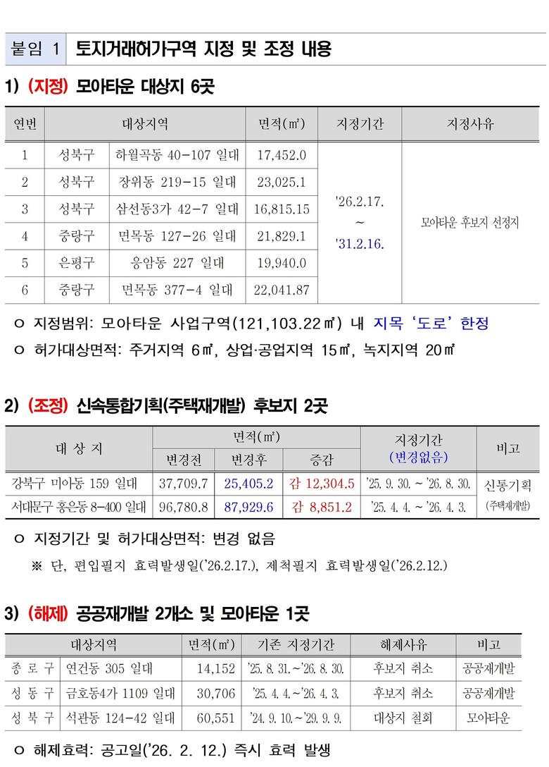 서울시는 2월 4일 제2차 도시계획위원회에서 주민제안 모아타운 신규 신청지역 6곳(성북구 3곳, 중랑구 2곳, 은평구 1곳)의 지목 도로를 토지거래허가구역으로 신규 지정했다고 밝혔다. 지정기간은 2월 17일부터 2031년 2월 16일까지 5년간이다.