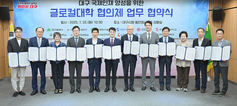 ▸ 글로컬일자리주식회사 설립, 국제학생 정주형 계약학과 운영 등 중점 [세계타임즈=대구 한윤석 기자] 대구광역시는 22일(화) 동인청사에서 달서구, 달성군, 계명대학교를 비롯한 지역 9개 대학과 함께 ‘대구 글로컬대학 협의체’ 업무협약(MOU)을 체결했다.