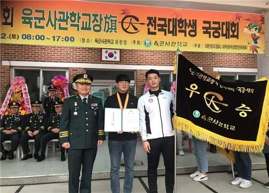 | ▲ 육군사관학교 정진경 교장이 전북대학교 국궁팀에게 우승기를 전달하는 모습 |