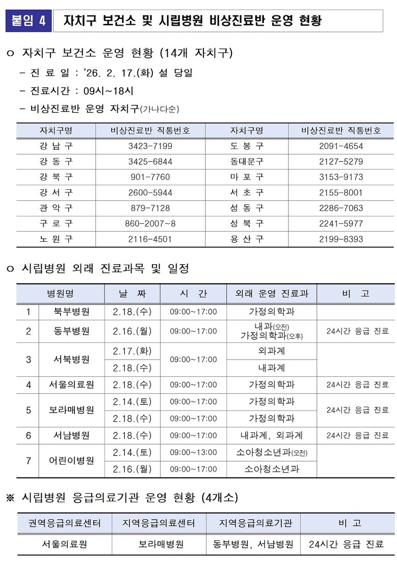 - 시립병원·보건소 ‘비상진료반’ 운영…4개 시립병원 24시간 응급진료, 14개 보건소 설 당일 진료