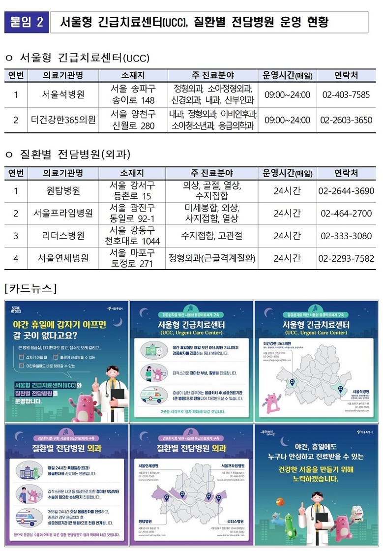 서울형 긴급치료센터는 매일 09시부터 24시까지 외상, 고열 등 급성질환을 진료하고, 질환별 전담병원은 매일 24시간 외과계 응급환자를 진료한다.