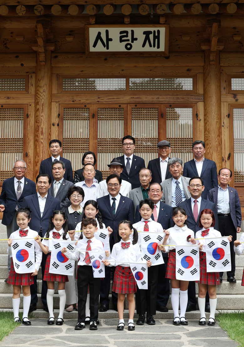 [세계타임즈 = 심귀영 기자] 우원식 국회의장이 15일 오후 국회 사랑재에서 열린 제79주년 광복절 기념 독립운동가 후손 초청 오찬에 앞서 기념 촬영을 하고 있다. 2024.8.15