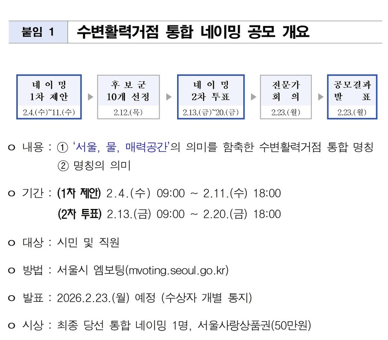 이번 공모는 2월 4일(수)부터 23일(월)까지 20일간 진행되며, 서울시 엠보팅 누리집(mvoting.seoul.go.kr)을 통해 시민 누구나 참여할 수 있다. 1차 명칭 제안(2.4.~2.11.) 후 심사를 거쳐 후보군 10개를 선정하고, 2차 시민 투표(2.13.~2.20.)와 전문가 회의를 거쳐 2월 23일 최종 당선작을 발표한다.