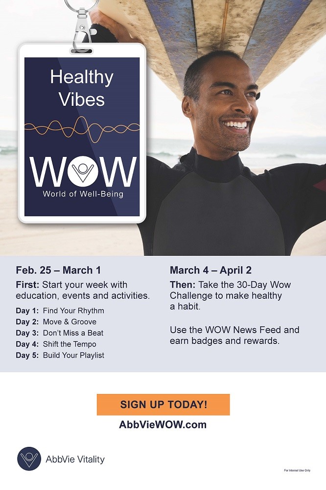 전세계 애브비 직원 대상으로 실시되는 WOW웰빙 캠페인은 규칙적인 생활 습관, 신체 운동, 자아성취감 등을 포함한 전인적 차원의 복지 프로그램으로 올해 3회째 지속되고 있다.