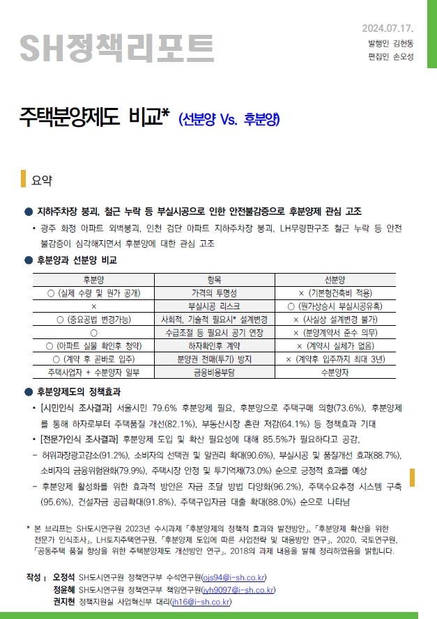 SH공사는 주택분양제도인 선분양과 후분양을 누구나 쉽게 알 수 있도록 정보를 제공하고, 공공주택 품질 향상 및 이미지 개선 등에 기여하기 위해 이번 정책리포트를 준비했다.