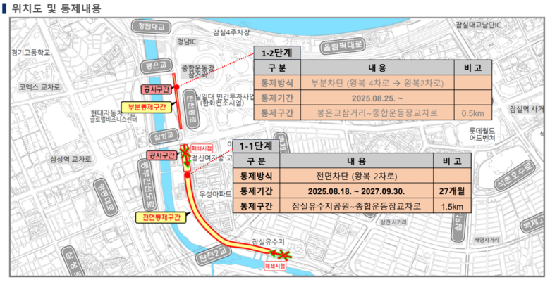 서울시에 따르면, 종합운동장 인근 주변 도로개선공사 시행으로 인해 오는 8월 18일 ~ 2027년 9월 30일(약 27개월)까지 잠실유수지공원 ~ 종합운동장교차로(약 1.5km) 구간은 전면 통제된다. 또한, 8월 25일부터는 봉은교삼거리 ~ 종합운동장교차로(0.5km) 구간을 왕복 4차로에서 왕복 2차로 줄여 신속하게 공사가 진행될 수 있도록 불가피한 결정을 내렸다.