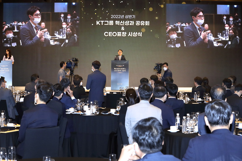 또 구성원의 성장이 곧 회사의 경쟁력과 직결되는 만큼 이에 대한 격려도 이어졌다. 특히 최근 고용노동부 주관 IT 경진대회 ‘K-디지털 트레이닝 해커톤’에서 대상 수상이라는 쾌거를 이뤄낸 KT 에이블스쿨 출신 신입사원이 2022년 상반기 직원 성장 분야 우수 직원으로 선정돼 큰 박수를 받았다.