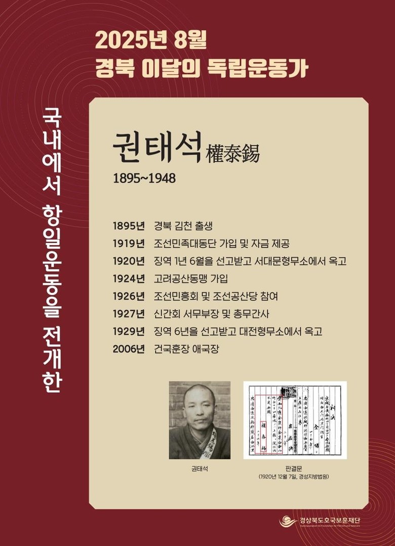 김천 출신의 권태석(權泰錫) 선생은 1919년 조선민족대동단에 가입 하여 자금을 제공하는 일을 맡았다. 이 일로 징역 1년 6월을 선고 받았고, 옥고를 치렀다. 출옥 이후 사회주의 단체인 서울청년회에서 활동하였으며, 1924년 고려공산동맹에 가입하였다.