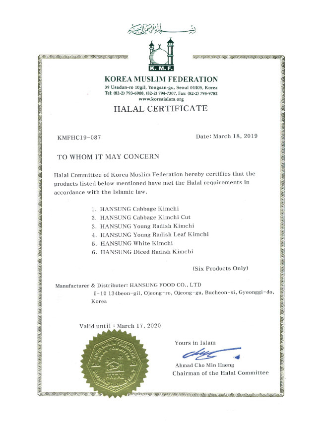 배추 등 야채는 자연 그대로를 활용하고 이슬람 율법에서 금지하는 알코올이나 돼지고기 등의 재료를 넣지않고 만들었으며, 2013년 10월 이슬람 할랄(HALAL) 인증 마크를 획득했다. 현재 한성식품은 말레이시아, 싱가포르, UAE 두바이 등의 할랄 시장에 할랄 인증 김치를 수출 중이며, 인도네시아는 2020년에 수출 예정이다.