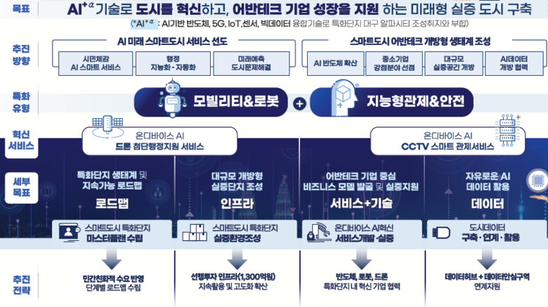 대구광역시는 수성구 고산2동 일원(알파시티 포함)에 향후 3년간 총 168억 1,500만 원(국비 80억 원, 지방비 80억 원, 기타 8.15억 원)의 예산을 투입해, ‘모빌리티 & 로봇’, ‘지능형 관제 & 안전’의 특화 분야 중심으로 미래형 실증 스마트도시 특화단지 조성을 본격 추진할 계획이다.