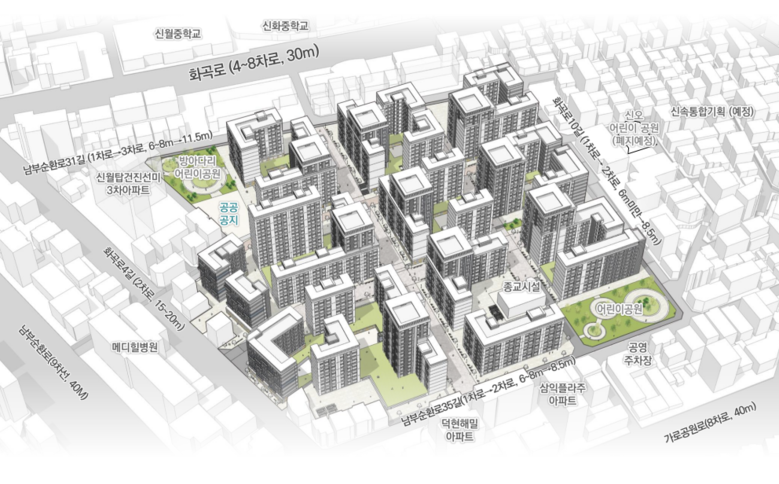 사업지 동측에 연접하여 추진중인 신월5동72번지 일대 신속통합 재개발 사업지와 연계하여 동서간 공공보행통로를 계획하였으며, 공공보행통로 주변으로 돌봄센터, 경로당 등 개방형 커뮤니티시설을 배치하여 지역 커뮤니티를 활성화하고 자연스러운 보행자 유입을 유도하였다.
