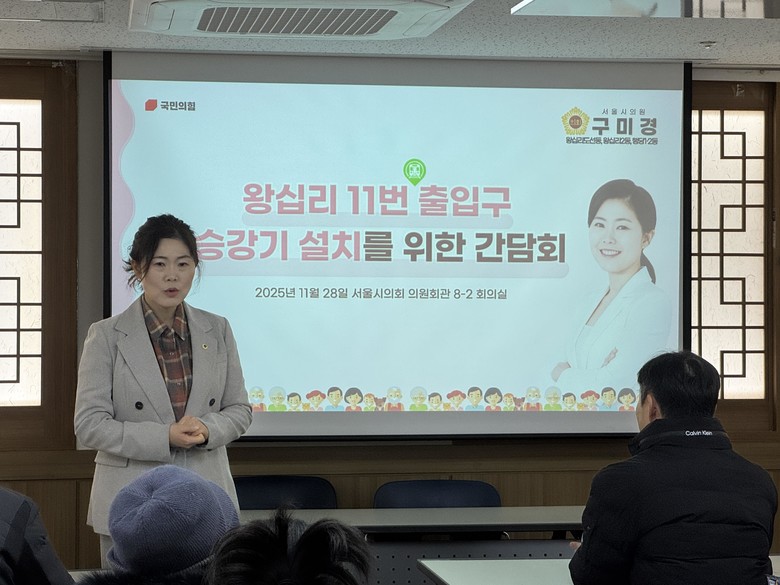 [서울 세계타임즈=이장성 기자] 서울특별시의회 기획경제위원회 구미경 시의원(국민의힘, 성동구 제2선거구)은 11월 28일(금), 서울시의회 8-2회의실에서 ‘왕십리역 11번 출입구 승강기 설치를 위한 간담회’를 개최했다.