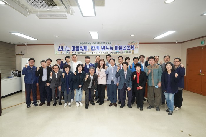 [수성구=세계타임즈 한성국 기자] 수성구의회 의원연구단체인 ‘지방자치 혁신 사례 연구모임’(회장 김두현 의원)은 지난 17일 오후 3시 의회 2층 회의실에서 전문가, 연구단체 회원, 마을축제 관계자, 공무원, 주민 등 40여명이 참석한 가운데 ‘신나는 마을축제, 함께 만드는 마을공동체’라는 주제로 토론회를 개최하였다.