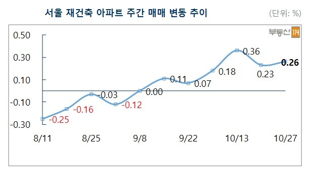 27일 부동산114가 발표한 주간 아파트가격 동향에 따르면 10월 마지막주 서울 매매가격은 0.19% 상승했다. 이번주 상승률은 전주(0.20)%와 비슷한 수준을 보였다.