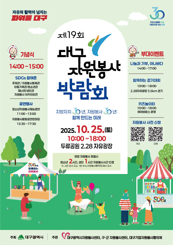 특히 ‘자원봉사 아카이브 전시관’에서는 대구 자원봉사 활동 30년의 역사를 돌아보며, 산불 피해 복구 등 재난 극복과 지역사회 발전을 위해 헌신한 자원봉사자들의 활동상을 조명할 예정이다.