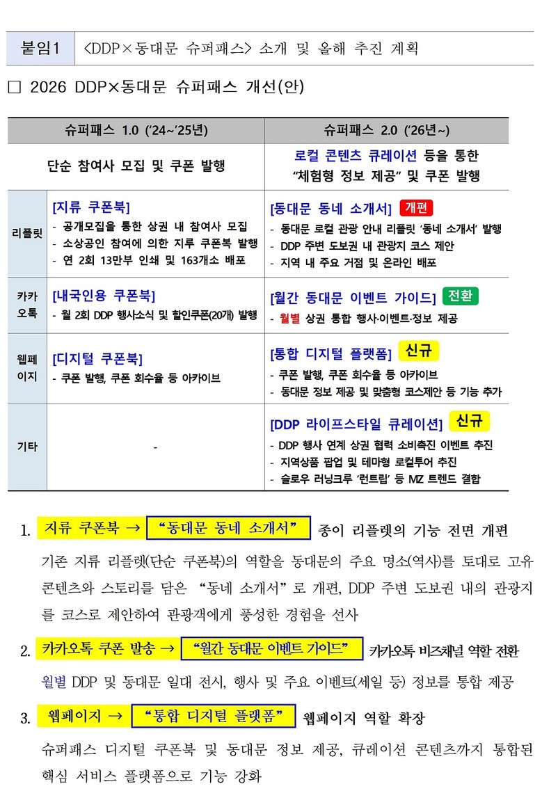 - 주변 상권, 현대아울렛, 두타몰, 밀리오레 등 협력 홍보 추진…상권 공동 마케팅 활짝 [서울 세계타임즈=이장성 기자] 서울디자인재단(대표이사 차강희, 이하 재단)이 ‘DDP×동대문 슈퍼패스’를 할인 쿠폰형 서비스에서 동대문 일대 로컬 상권을 연결하는 경험형 플랫폼으로 전면 개편한다. 쇼핑·식사·체험·관광을 아우르는 추천 코스를 통해 방문객이 동대문을 ‘점’이 아닌 ‘코스’로 머물며 즐길 수 있도록 확대 운영할 계획이다.