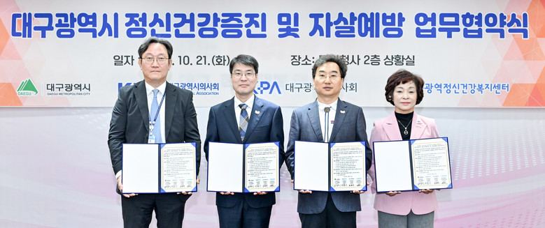 김정기 대구광역시장 권한대행 행정부시장은 “정신건강 문제는 누구나 겪을 수 있는 일반적인 문제로, 지역 공동체와 함께 고위험군을 조기에 발굴하고 지원 체계를 갖추는 것이 무엇보다 중요하다”며, “이번 협약식이 그 출발점이 되길 바라며, 대구 시민 모두가 나를 지키고 주변을 지키는 생명지킴이 역할을 해주시길 바란다”고 말했다.