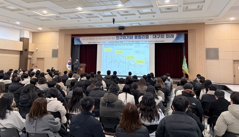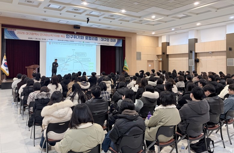 ▸ 전영수 한양대 교수, ‘인구위기와 로컬리즘:대구의 미래’ 주제 강연 [세계타임즈=대구 한윤석 기자] 대구광역시는 1월 28일(수) 오전 10시, 시청 산격청사 대강당에서 ‘2026 대구광역시 인구감소위기대응 특강’을 개최했다.