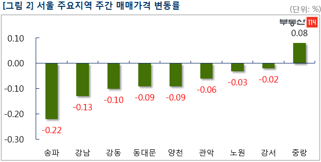 강남은 개포지구 일대 아파트 가격이 큰 폭으로 빠졌다. 특히, 착공 지연으로 오는 4월부터 입주권 거래가 재개되는 개포주공1단지가 금주 5,000만원-2억원 가량 가격이 하향 조정됐다. 강동은 고덕지구 대규모 아파트 입주를 앞두고 기존 아파트값이 약세를 보이고 있다. 고덕동 고덕래미안힐스테이트가 면적별로 1,000만원씩 내렸다. 양천은 대출이 막히면서 매수 움직임이 없는 가운데 신정동 목동신시가지13단지가 500만원-1,500만원 하락했다. 반면, 집값이 상대적으로 저렴한 △중랑(0.08%)은 오름세를 나타냈다. 중화동 한신1차가 1,000만원 올랐다.