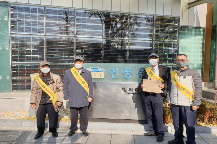 (사진=촛불계승연대와 한국전쟁전후 민간인피학살자 전국유족회 관계자들이 청와대 앞에서 함께 사진을 찍고 있다)
