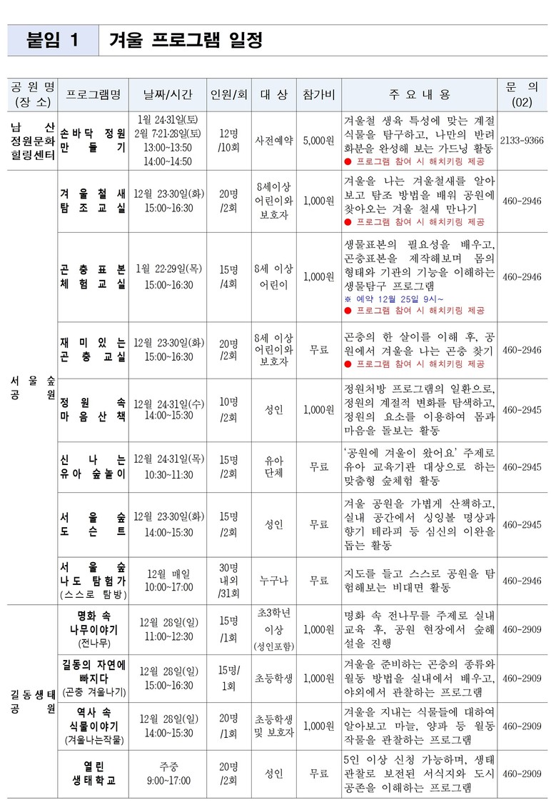 - ‘해치의 겨울정원여행’ 연계 키링 제공, 공공서비스예약 선착순 접수 [서울 세계타임즈=이장성 기자] 서울시는 다가오는 겨울방학을 맞아 서울의 공원 9곳에서 가족이 함께 즐길 수 있는 다양한 ‘겨울 공원 프로그램’ 42개를 운영한다고 밝혔다.