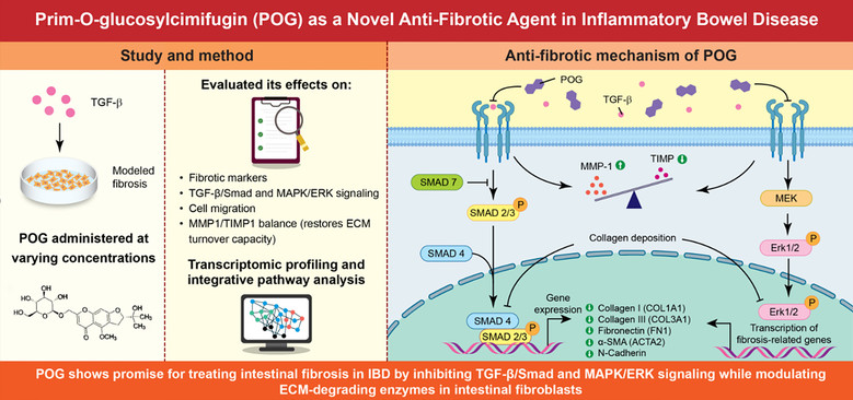 연구결과 POG는 TGFβ /MAPK 신호전달 경로를 조절하고, 세포외기질(ECM)재구성을 억제함으로써 과도한 섬유화 반응을 완화하는 분자적 기전을 보유하고 있다. POG는 섬유아세포의 활성화를 억제하고, 콜라겐 침착을 감소시켜 장 조직의 구조적 손상을 완화하는 데 탁월한 효과를 보였다.