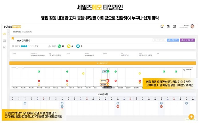 세일즈 메모 타임라인, 영업 활동 내용과 고객 등을 유형벌 아이콘으로 전환하여 누구나 쉽게 파악할 수 있다. 진행 중인 영업의 상태 즉 자료 전달, 확정, 일정 연기, 고객 불만 등과 가격 등 영업 이슈를 아이콘으로 확인할 수 있고 전화 등 영업활동 유형, 영업 이슈, 만났던 고객 이름, 다음 예상 일정 등을 아이콘으로 쉽게 알 수 있다.