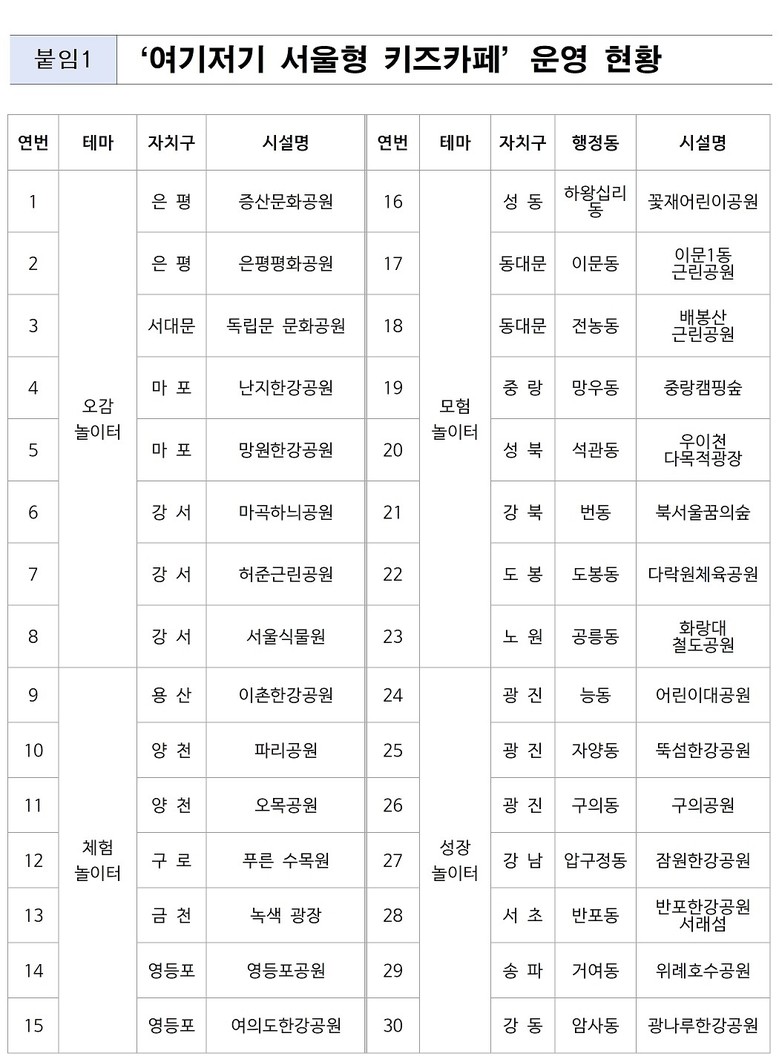 - 4~9세 아동 대상, 입장료(아동) 5천 원, 6일 사전예약 오픈, 당일 현장접수도 받을 예정 [서울 세계타임즈=이장성 기자] 지난해 아동 1만 9천여 명이 방문하며 큰 호응을 얻었던 주말 특화형 야외 키즈카페 ‘여기저기 서울형 키즈카페’가 운영 기간을 3개월에서 6개월로 늘리고, 개최 장소도 인기 명소 중심 30곳으로 확대하여 시민들을 찾아간다.