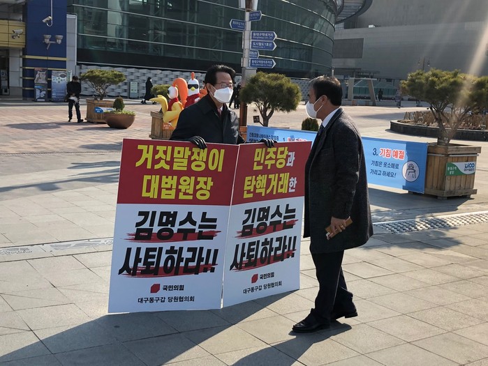 류 의원과 대구 동구 당원협의회 소속 당원들은 설날 연휴를 맞아 ‘거짓말쟁이 대법원장 김명수는 사퇴하라’, ‘민주당과 탄핵 거래한 김명수는 사퇴하라’라는 내용의 피켓을 들고 정부 여당과 민주당 정권의 사법부를 규탄한다.