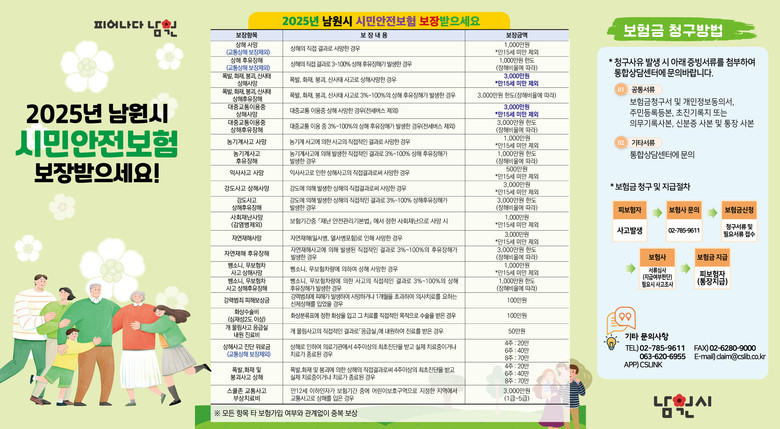 남원시 시민안전보험은 2021년부터 시행하여 2025년 5월말 기준 총1,365건 약 12억 2천만원의 보험금이 시민들에게 지급되었으며, 그동안 시민들의 일상 속 다양한 사고와 재난에 든든한 보장 역할을 해왔다.
