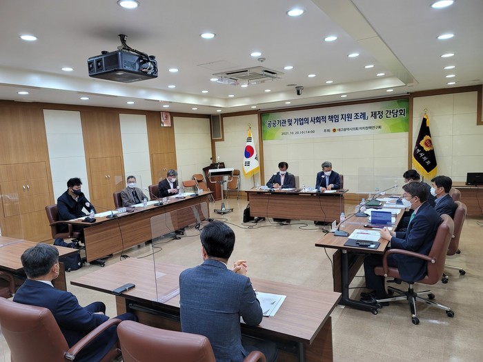 [대구=세계타임즈 한성국 기자] 대구광역시의회의 의원연구단체인 자치정책연구회는 20일(수) 오후 2시 공공기관 및 기업의 사회적 책임 활동을 제도적으로 지원하고자 관련 조례에 담을 사항을 논의하는 ‘조례 제정 간담회’를 시의회 3층 회의실에서 개최했다.