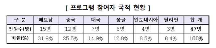 현재 베트남, 태국, 인도네시아, 필리핀, 몽골 등 아시아 주요 개발도상 국가의 대학생 47명을 선발하여 31명이 졸업하였으며,