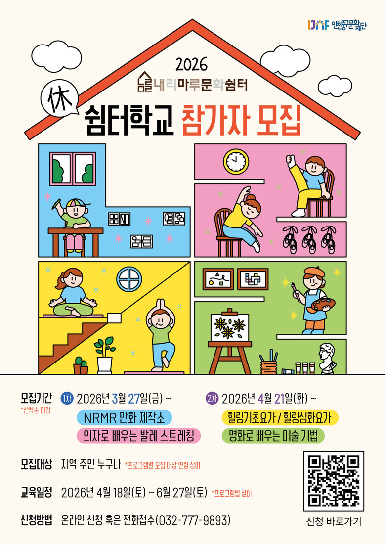 먼저 초등학교 3~6학년 대상의 ‘NRMR 만화 제작소’는 인천 중구를 소재로 만화를 제작하는 프로그램이며, 성인 대상 ‘의자로 배우는 발레 스트레칭’은 발레 기초 동작과 스트레칭으로 몸을 풀고 바른 자세를 만드는 프로그램이다.