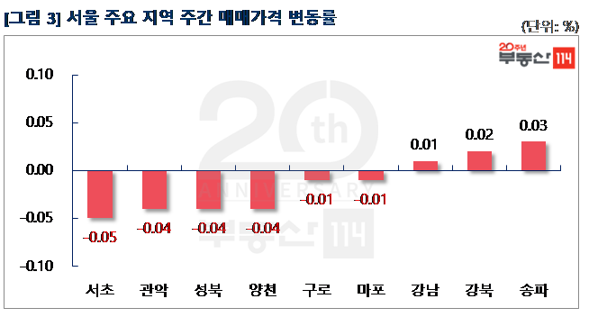 부동산114(www.r114.com)에 따르면 금주 서울 아파트 매매가격 변동률은 -0.01%로 집계됐다. 이는 작년 11월(11/16, -0.01%) 하락세로 돌아선 이후 가장 작은 낙폭을 기록한 것이다. 신도시와 경기ㆍ인천의 매매가격은 전주와 동일하게 각각 0.04%, 0.01% 떨어졌다. 전세가격은 서울이 0.02% 내려 전주(-0.07%) 대비 낙폭이 축소됐다. 신도시와 경기ㆍ인천은 각각 -0.02%, -0.05% 변동률로 약세를 이어갔다.