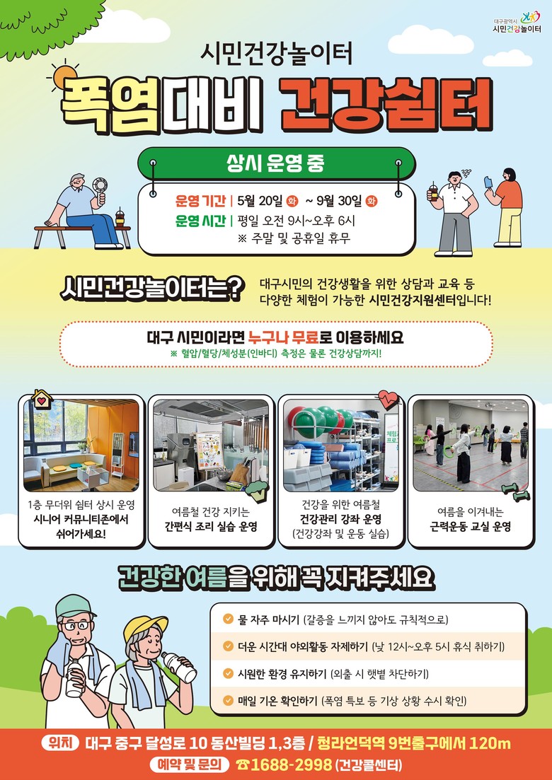 강연숙 대구광역시 건강증진과장은 “평년보다 무더운 날이 많은 올여름, 폭염 대비 건강 캠페인을 통해 시민들의 건강 보호에 최선을 다하고 있다”며, “온열질환 예방 수칙을 준수하셔서 대구 시민 모두가 건강하고 안전한 여름을 보내시길 바란다”고 말했다.