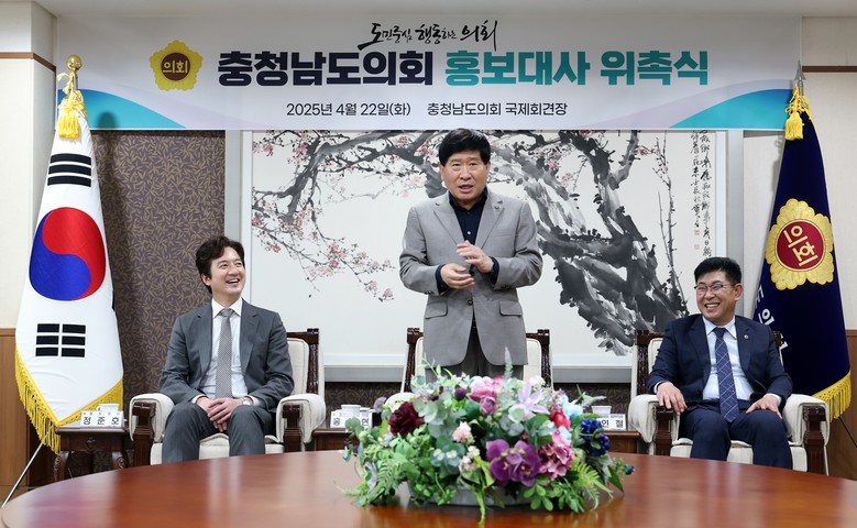 홍성현 의장은 “충남도의회는 불필요한 권위와 관행을 탈피하기 위해 노력해 왔다. 홍보대사께서도 특유의 재치와 진정성으로 이러한 의회의 활동을 널리 알려 주시길 바란다”며 “그동안 방송을 통해 충남에 대한 애정을 전해 주신 것에 감사드리며 앞으로도 활약을 기대한다”고 말했다.