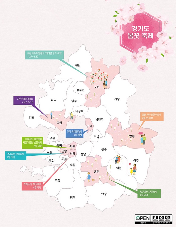 - 이천 산수유꽃·부천 진달래꽃·군포 철쭉·경기도청 벚꽃축제 등