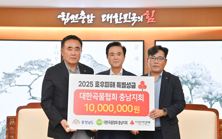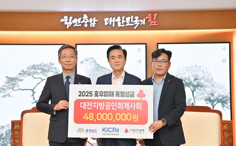 도는 11일 도청 외부접견실에서 태화홀딩스, 대전지방공인회계사회, 대전도시공사, 대한곡물협회충남지회가 호우 피해복구 지원 성금으로 1억 6800만원을 기탁했다고 밝혔다.