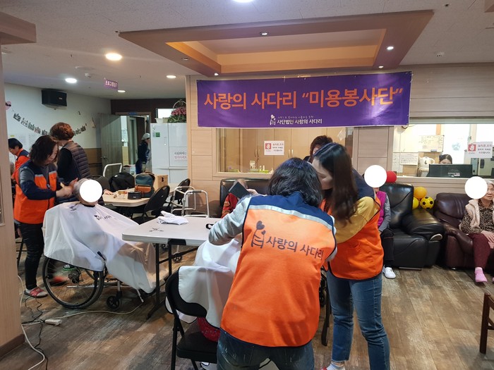 이날 미용봉사는 송남석 단장을 비롯해서 김미경 김보경 박소희 박유신 이미향 이하영 조은숙 조인숙 가위천사들이 1층, 3층, 별관에서 치매 및 와상 70명 어르신들에게 미용봉사를 하였다.