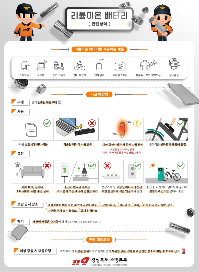 소방본부는 배터리 화재 대부분이 충전 과정에서 발생한다며, 현관 등 출입구 근처 충전 금지, 과충전 방지, 충전 중 주변 가연물 정리, 정품 충전기 사용, 배터리 손상 시 즉시 사용 중단 등 다섯 가지 안전수칙을 반드시 지켜야 한다고 강조했다.