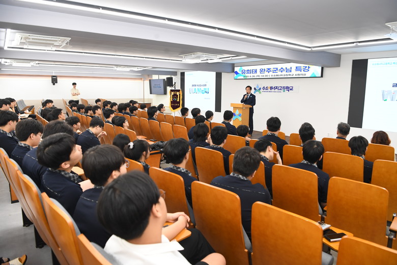 특강에서 유희태 완주군수는 “넓게 보고, 깊이 도전하는 삶”의 중요성을 강조하며, 끊임없는 자기계발과 도전 정신이 미래를 여는 열쇠임을 학생들에게 전했다.