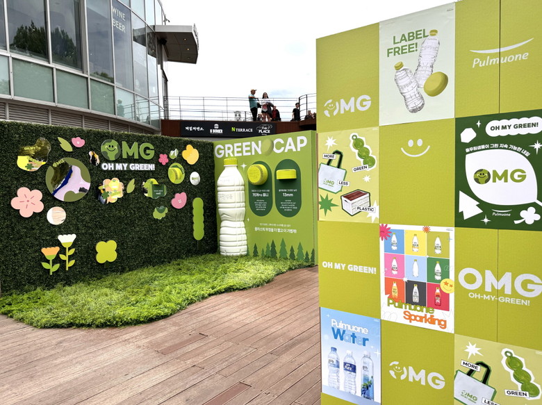 풀무원샘물은 지속가능한 내일을 그려가는 브랜드 캠페인 ‘OH-MY-GREEN(OMG)’ 컨셉에 맞춰 풀무원샘물 고유의 그린 컬러와 목재펄프와 종이로 만든 소재 ‘허니콤보드’를 사용해 부스를 꾸렸다. 부스 내부는 ‘그린라벨존’, ‘그린캡존’, ‘그린페트존’, ‘그린이벤트존’ 등 체험 콘텐츠 별로 공간을 구성해 방문객들이 다양한 경험을 할 수 있도록 했다.