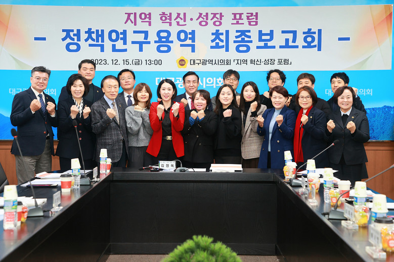[대구 세계타임즈=한윤석 기자] 대구시의회 의원연구단체 ‘지역 혁신·성장 포럼’(대표 김정옥 의원)은 12월 15일(금) 오후 1시 30분 의회 2층 회의실에서 소속단체 의원(대표 김정옥, 간사 박소영, 김원규, 류종우, 박종필, 윤권근, 이영애, 이태손, 하병문, 허시영, 황순자)이 참석한 가운데 정책연구용역 최종보고회를 개최했다.