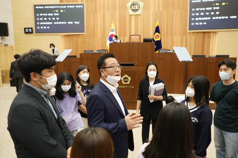 이날 학생들은 제78회 정례회 본회의를 앞두고 김학서 부의장과 만나 인사를 나누고 본회의장 시설 및 본회의 진행 과정에 대한 설명을 들었다.