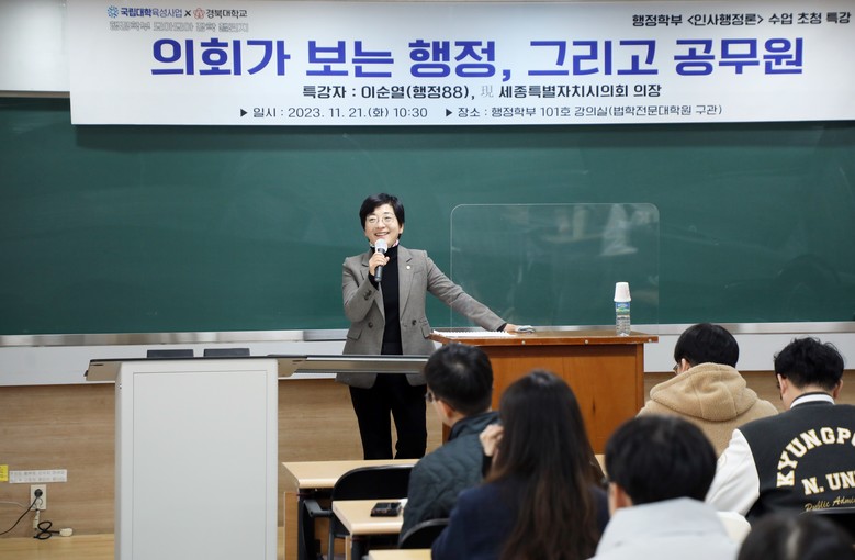 [세종 세계타임즈=김민석 기자] 이순열 세종특별자치시의회 의장은 모교인 경북대학교에서 ‘의회가 보는 행정’을 주제로 지난 21일 특별강연을 진행했다.