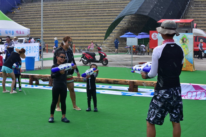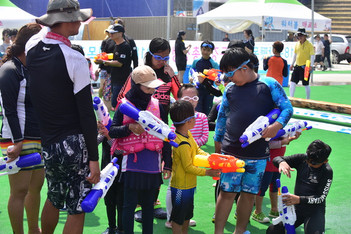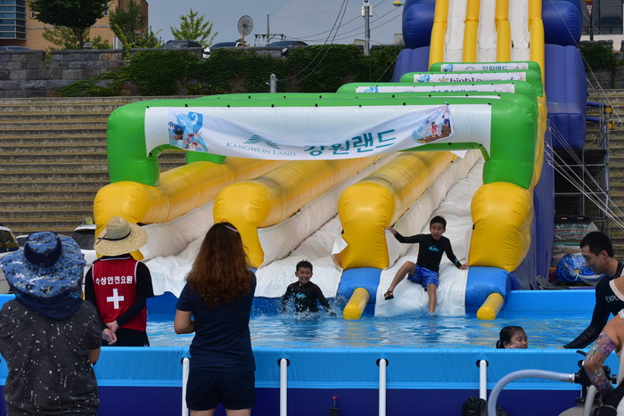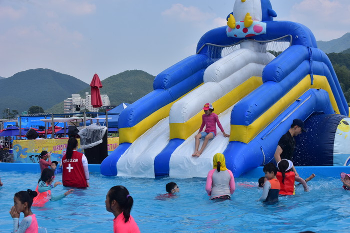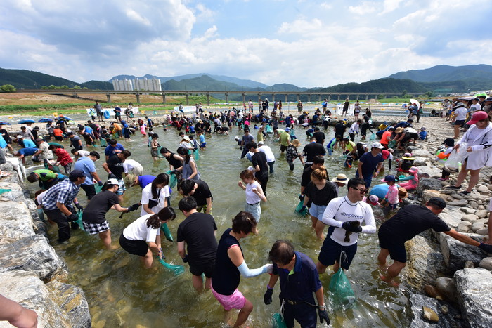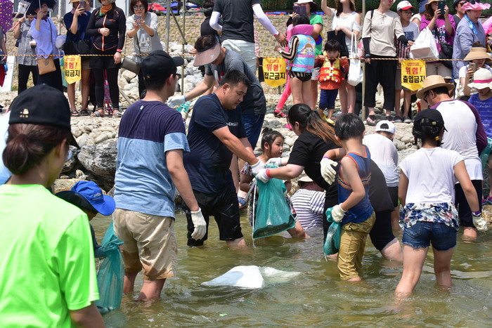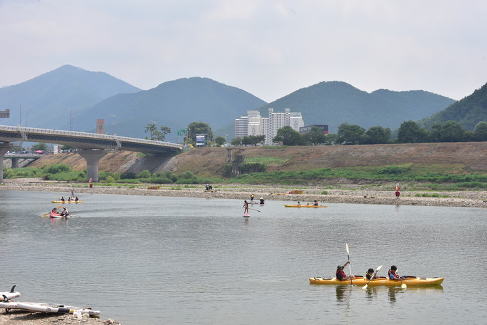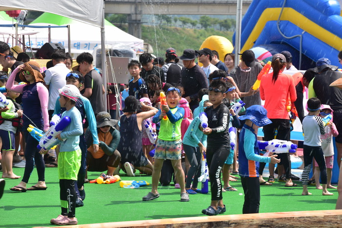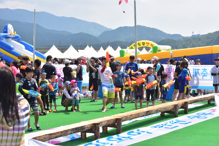 2018 동강뗏목축제에 방문한 관광객들이 시원한 물놀이를 하며 뜨거운 무더위를 달래고 있다.