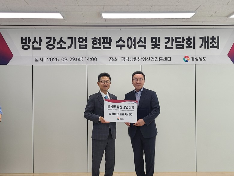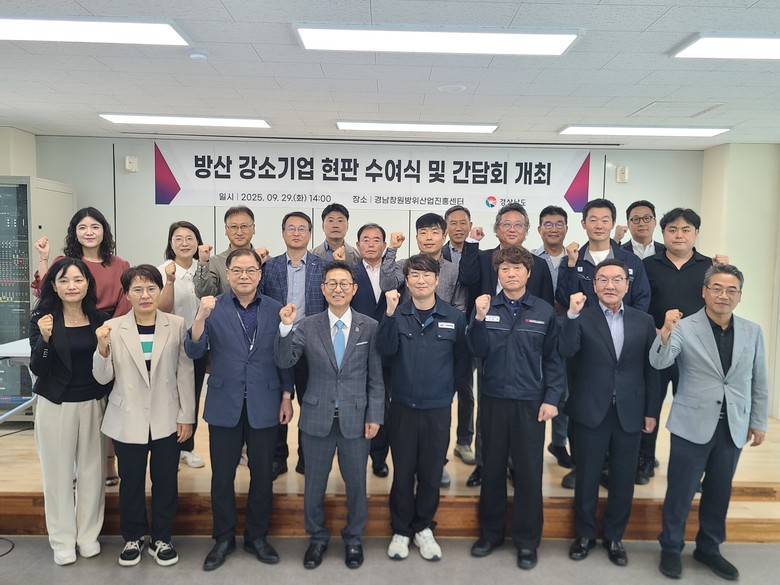- 기업 맞춤형 지원사업 성과 공유와 의견 청취 간담회 열어 [세계타임즈=경남 최성룡 기자] 경상남도(도지사 박완수)는 29일 경남창원방위산업진흥센터에서 ‘2025년 방산 강소기업 지정 현판식 및 기업 간담회’를 개최했다.