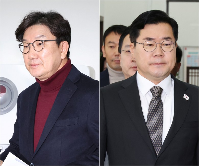 국민의힘 권성동 당 대표 권한대행 겸 원내대표(사진 왼쪽)와 더불어민주당 박찬대 원내대표(사진 오른쪽)가 22일 오전 국회에서 각각 기자간담회를 열고 발언하기 위해 이동하고 있다. 2024.12.22